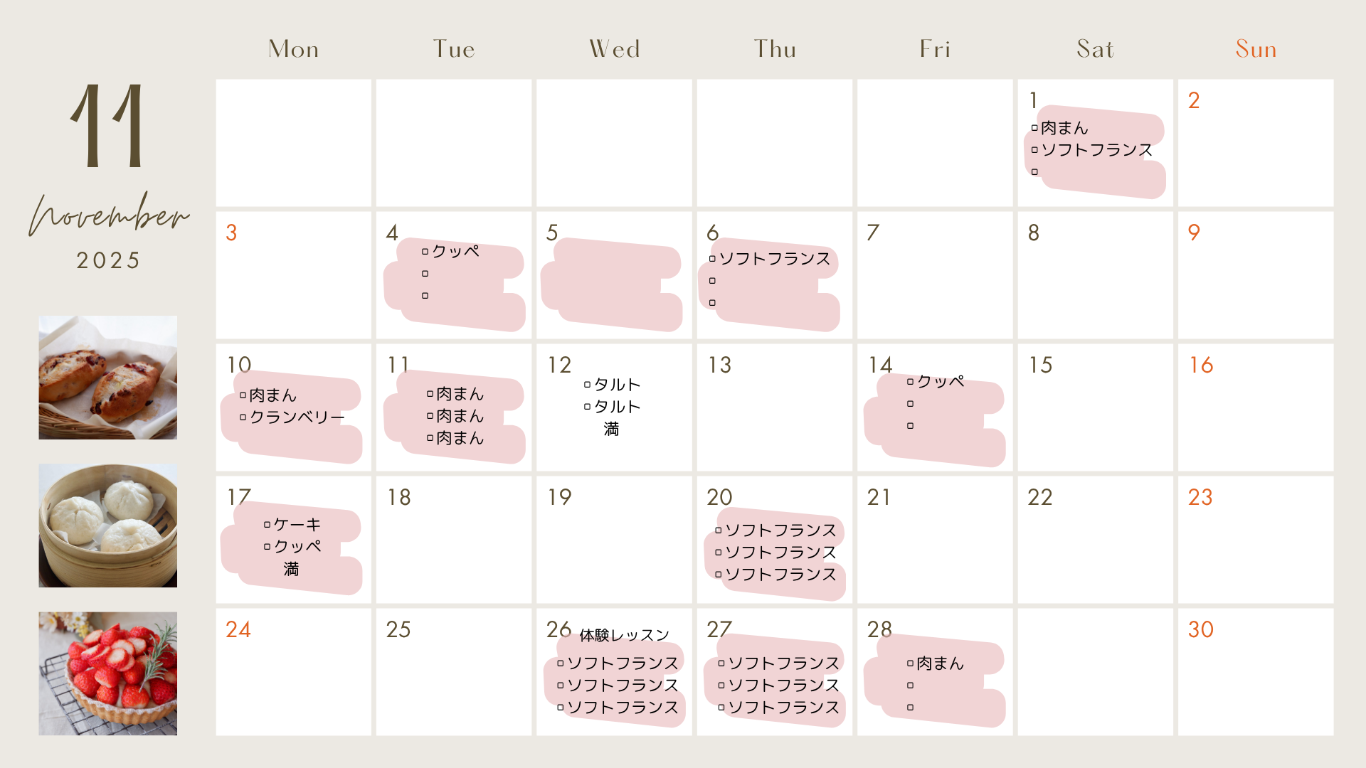 10月11月→クランベリークッペ、肉まん、フルーツタルト(苺は12月のみ)