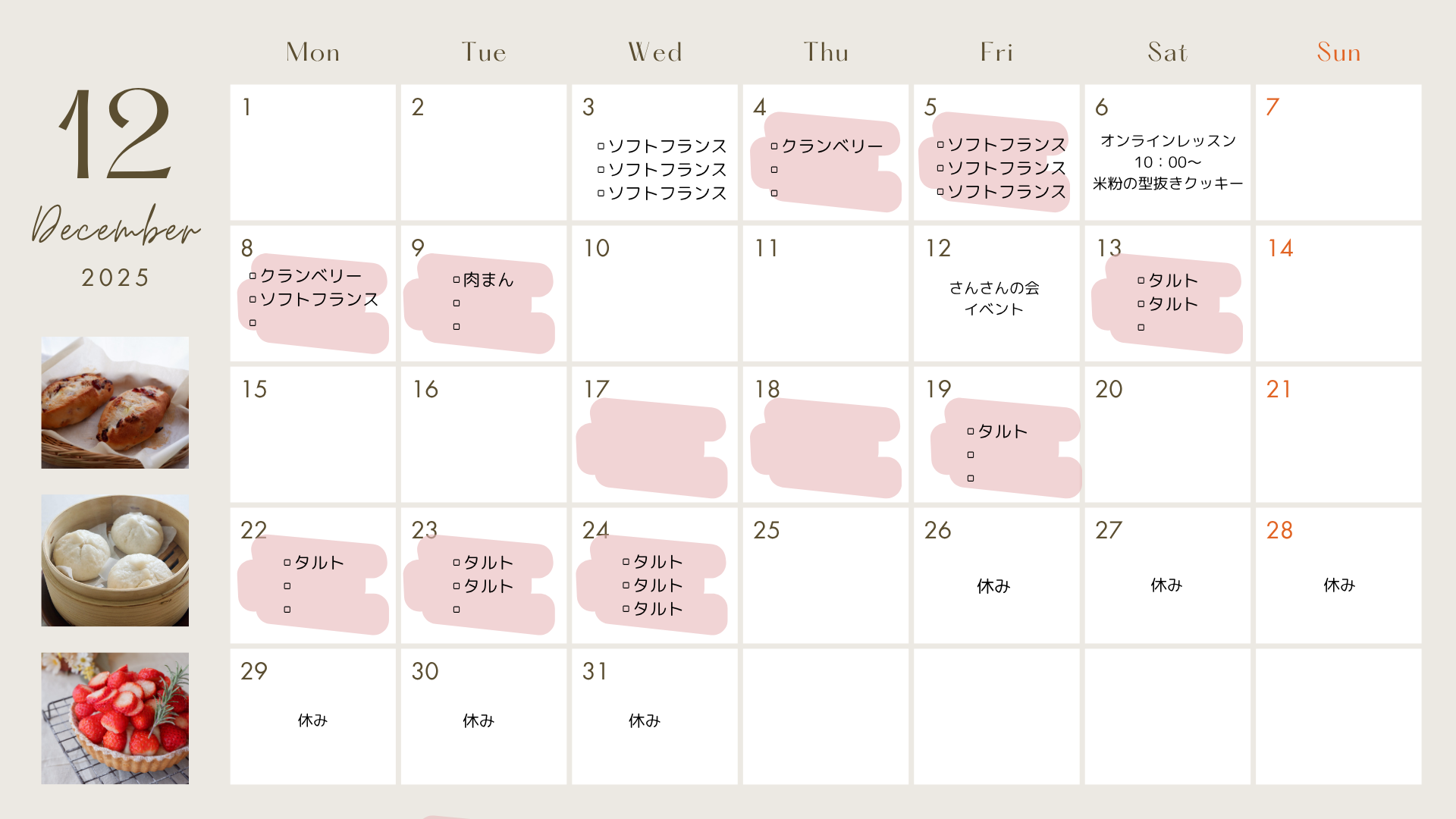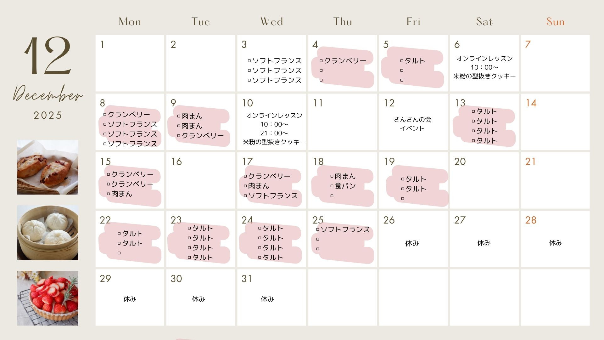 12月→クランベリークッペ、肉まん、イチゴタルト、食パン