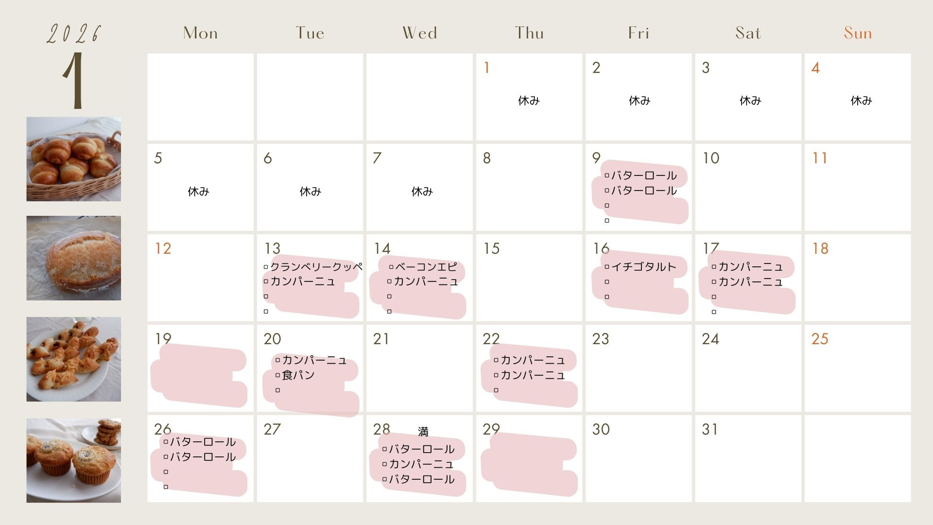 1月→カンパーニュ、ベーコンエピ、バナナマフィン、バターロール、食パン